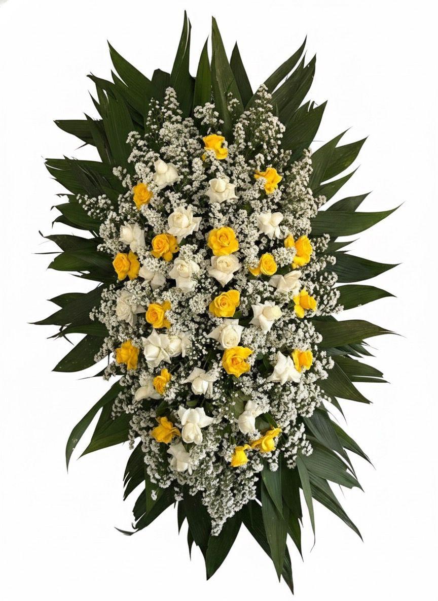 Composição: Rosas brancas e amarelas. Áster e aricana.